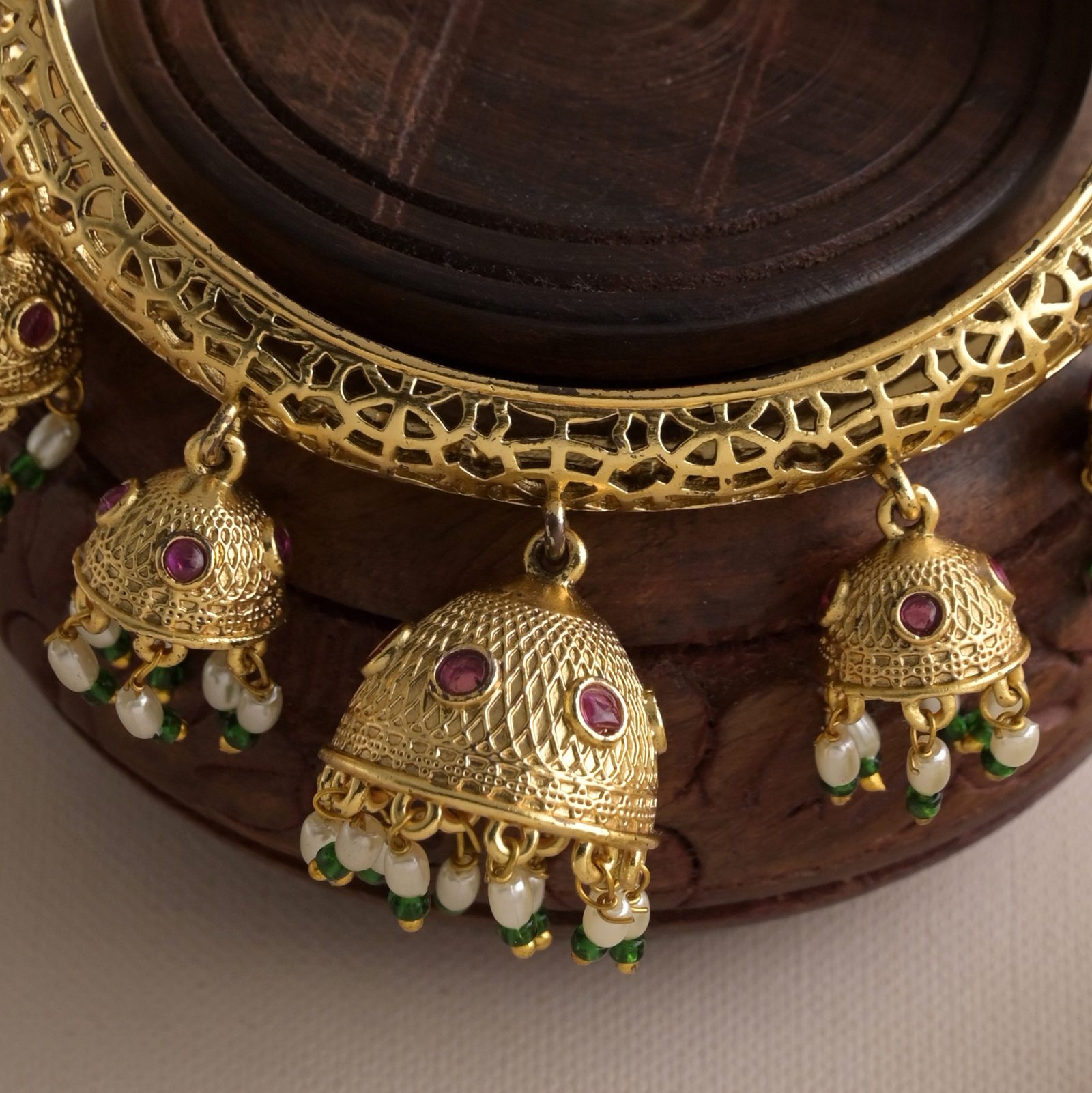 Experience regal elegance with the Raj Rani Jhumka AD Bracelet, a masterpiece of traditional charm and modern craftsmanship. This exquisite bracelet features intricate jhumka-inspired designs, adorned with sparkling American diamonds, reflecting royal heritage with a contemporary touch. Crafted to perfection, it seamlessly complements ethnic and fusion wear, making it an ideal choice for grand celebrations.
